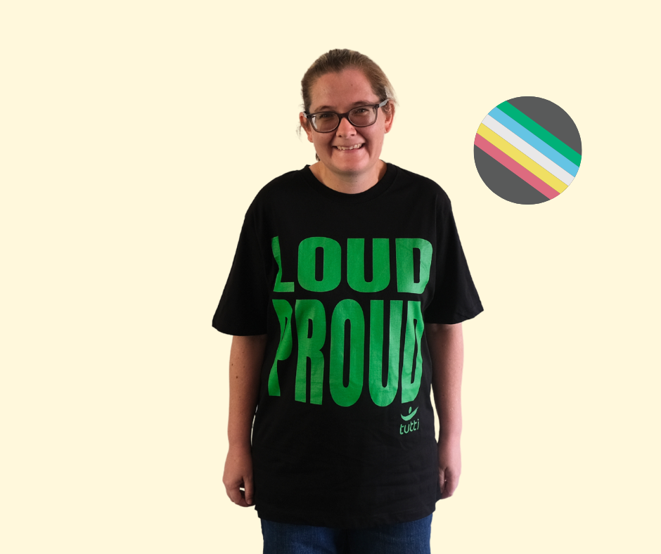 The disability pride design has no text on the back of the shirt. The front of both versions of the shirts read LOUD PROUD and feature a small Tutti Arts logo in your chosen colour.